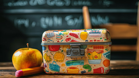 A vibrant lunchbox filled with playful designs, accompanied by a fresh apple and a colorful pencil on a rustic wooden table, ideal for school settings.