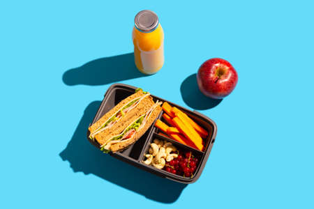 Delicious healthy sandwich in a lunch box, cookies and cherries. Take lunch with you to school or the office, Juice in a bottle and an apple
