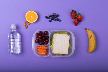 Directly above shot of healthy food and tiffin box by water bottle on purple background, copy space. unaltered, food and healthy eating concept.