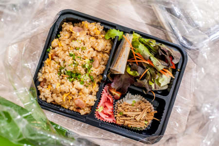 The view of the quarantine food box that includes Japanese fried rice,garden salad ,Stir-fried mushroom in Bangkok ,Thailand