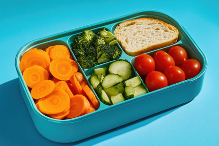 Healthy lunchbox filled with various fresh vegetables, bread, and cherry tomatoes, promoting a balanced and nutritious meal