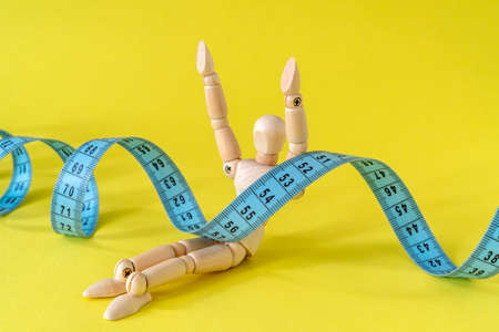 Roll of blue tape measure untwisted on turquoise background with copy space as symbol of weight management