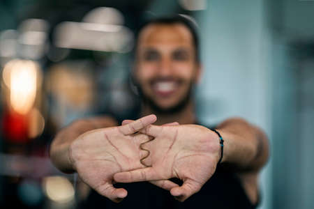 Closeup Shot Of Smiling Black Male Athlete Stretching Fingers Before Sport Training