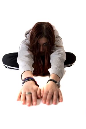 Woman with genetical disorder in sports outfit doing stretching and warming up
