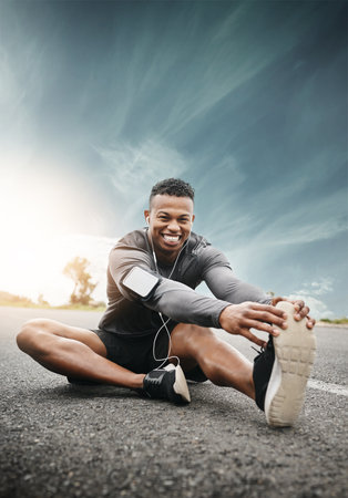 Athlete, man and stretching at stadium for fitness, exercise and getting ready for marathon. Male person, relax and warm up muscles for training, runner workout and preparation of sports competition