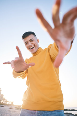 Frame, summer and a man with hands at the beach with happiness, freedom and creativity. Smile, portrait and a young person at the sea with a gesture for perspective on a vacation at the ocean
