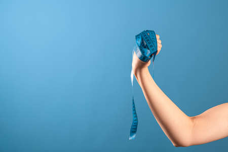 Sports and a healthy lifestyle, a figure without excess weight and good health. A female hand holds a centimeter ribbon in his fist, blue background