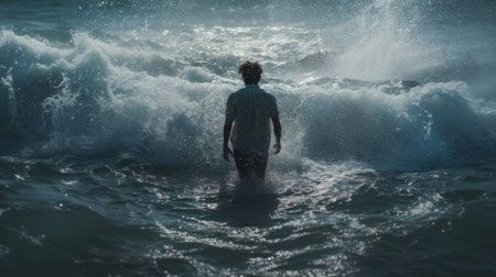 A man walking through the water with the waves parted.