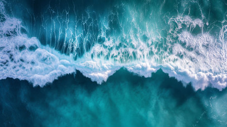 The majestic beauty of the ocean as viewed from a drone, showing the detailed textures and forms of waves crashing into the sea from a top view perspective.