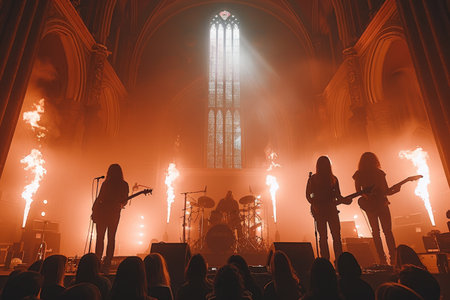 A Silhouetted Band Performing on Stage with Fire Effects in a Church