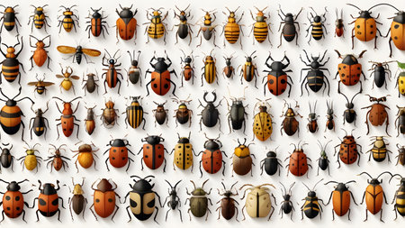 A vibrant arrangement of various beetle species showcasing unique colors and patterns. Ideal for educational and creative projects related to nature and biodiversity.