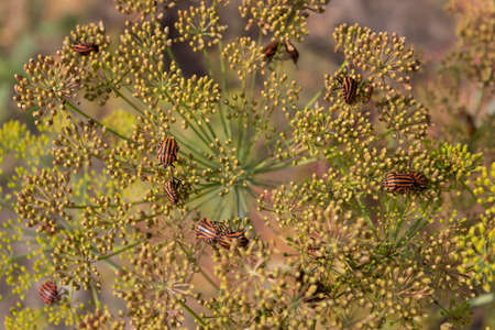 On a branch of dill, there are many orange beetles with a black stripe called a lineage, or striped graphosome (lat. Graphosoma lineatum).