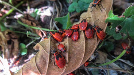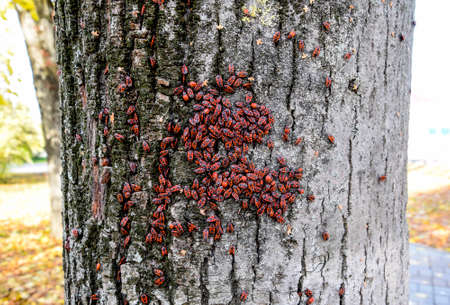 Red bugs bask in the sun on tree bark. Autumn warm-soldiers for beetles.