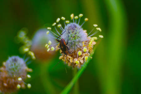 Small beetle Cerambycidae on shiny green grass with dew drops near daisy close-up with copy space. Pure, pleasant, nice greenery with rain drops in sunlight in macro. Green plants in rain weather.
