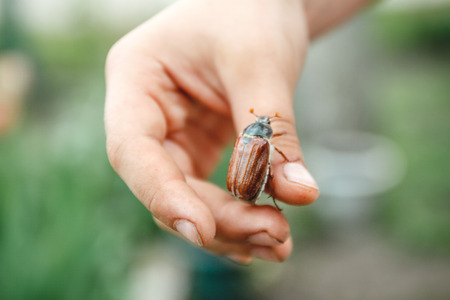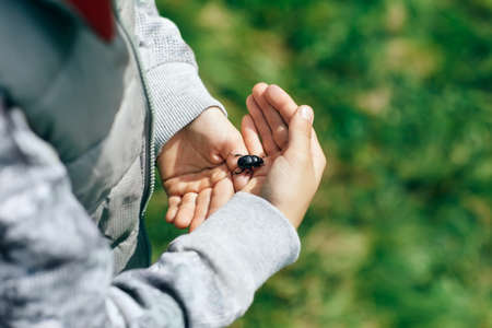 Boy holds captured beetle in palm of his hand, close-up. Large shiny black chafer creeps along palm of hand. Baby gently holding Maybug