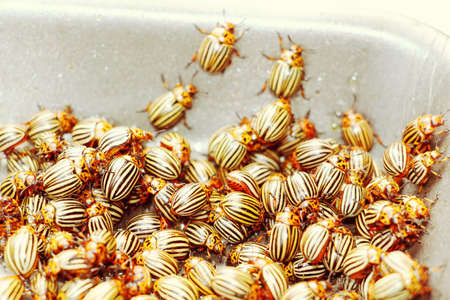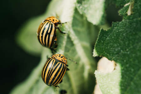 Colorado potato beetle. Pests and parasites of potatoes in the garden in summer.