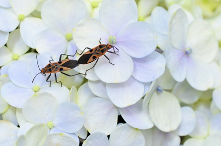 A red bug is standing on a white flower. The flower is surrounded by green leaves