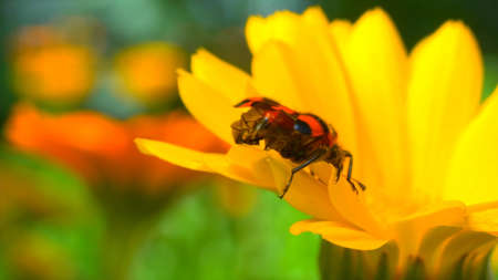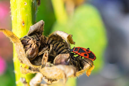 Pyrrhocoris apterus is on the chamomile. Bug on the flower.