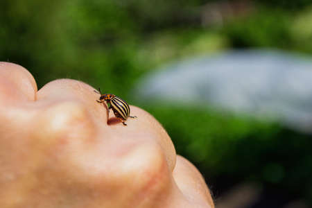 Pests of agricultural plants. Colorado potato beetle or potato leaf beetle (Latin: Leptinotarsa decemlineata) it sits on the farmer's arm. Selective focus, soft blurry background.