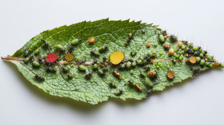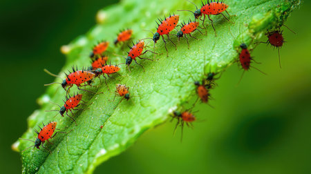 A detailed close-up of a green leaf adorned with various insects, showcasing the complexity of ecosystems and biodiversity in nature's environment.
