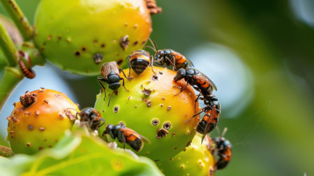 A vibrant close-up captures busy insects feeding on green fruit with orange spots, showcasing the intricate details of nature's pollinators.