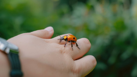 A vivid close-up image showcasing an orange and black beetle exploring a person's hand, set against a soothing green nature backdrop, highlighting the beauty of insects.