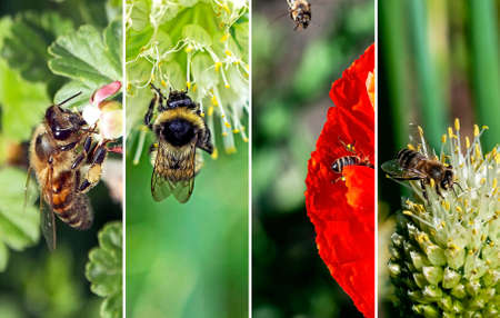 Illuminated photo of bees and flies eating old and rotten apples and pears in the slop pail. Group of insects on the overriped heap of pears and apples - natural light.