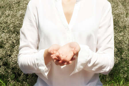 Gratefulness – Woman expressing gratitude with hands. Close up image of female hands in prayer position outdoor. Self-care practice for wellbeing
