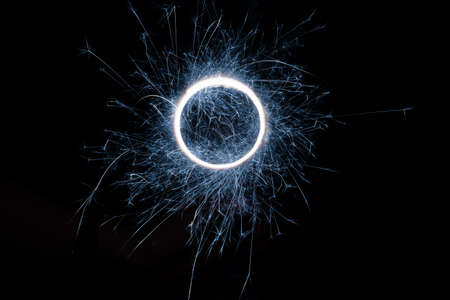 Ring of light from a sparkling burning sparkler or salute on a black background. Holiday concept, copy space.