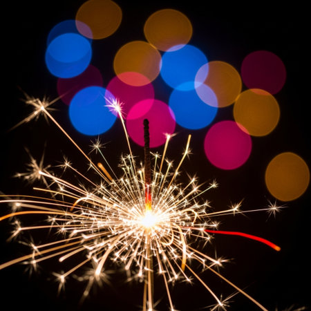 A vibrant sparkler sparks to life, casting a warm glow on its surroundings. Colorful bokeh lights dance around, creating a festive atmosphere perfect for celebrations and memories.