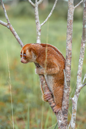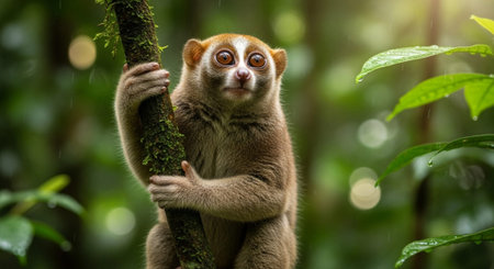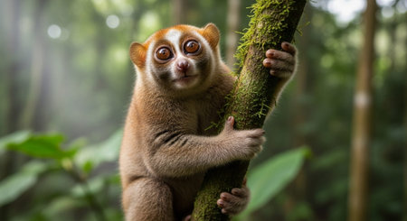 A Slow Loris (Nycticebus) peeking from a tree hollow in the rainforests of Borneo, its large, round eyes and gripping hands a cute yet elusive sight.
