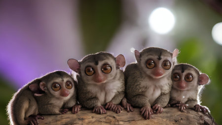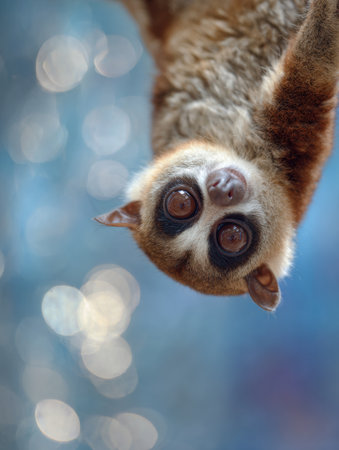 This slow loris is hanging upside down, showcasing its charming face, surrounded by a dreamy bokeh background that adds a whimsical touch.