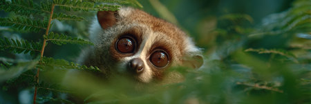 A slow loris quietly observes its surroundings from within dense foliage, showcasing gentle tones and an inviting space for text on the right side.