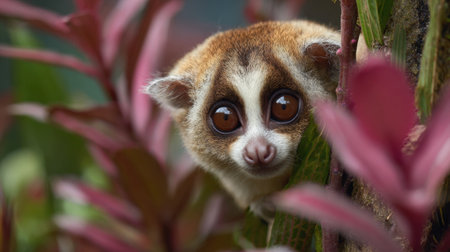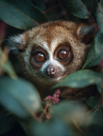 A slow loris cautiously peers through vibrant foliage, its large eyes reflecting curiosity.