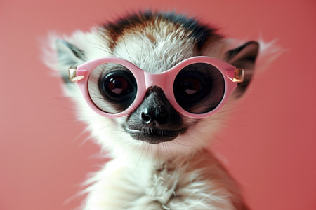 Lemur wearing oversized pink sunglasses set against a vibrant pink background