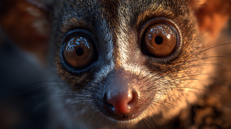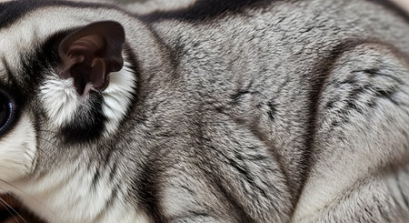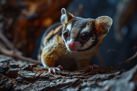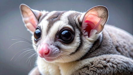 A detailed macro portrait captures the inquisitive expression of an adorable sugar glider. With its large, dark eyes and twitching pink nose, this tiny marsupial seems to be observing its surroundings with a sense of gentle wonder and curiosity.