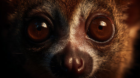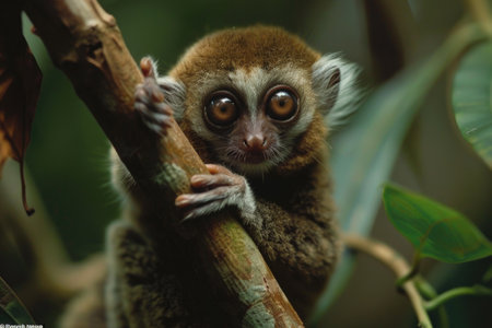 A night monkey clings to a branch its large expressive eyes scanning the surroundings. The dim light casts a soft glow highlighting its curious expression and unique features