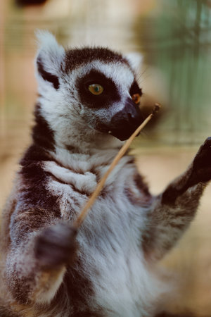 Close up photo of ring tailed lemur. Cute animal with protruding muzzle and orange eyes