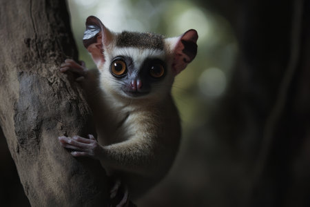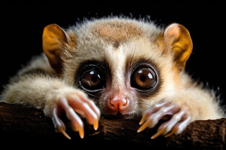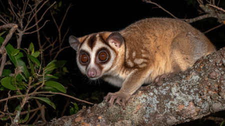 A nocturnal primate, the slow loris, with large eyes, sits on a textured tree branch in the dark.