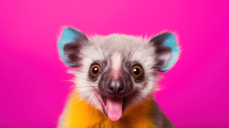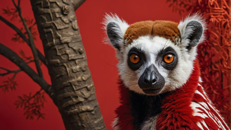 AI Generated. A striking image of a lemur with intense eyes on a contrasting red background, showcasing bold color and fauna