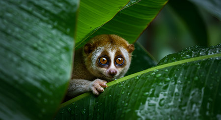 A slow loris is curiously peeking out from behind vibrant foliage, showing its large expressive eyes in a calm and gentle rainforest setting.