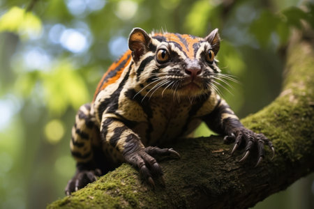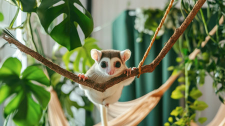A charming sugar glider perches on a tree branch, surrounded by tropical greenery. Its expressive eyes and soft fur showcase the beauty of wildlife in a vibrant habitat.