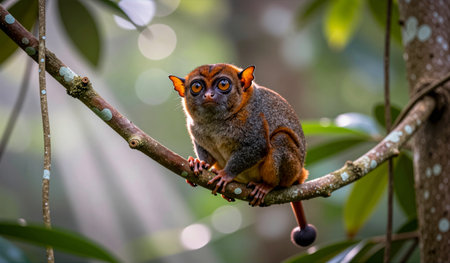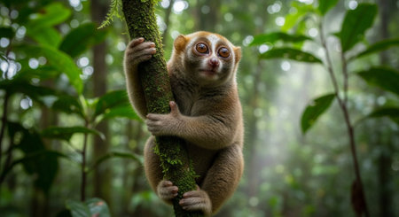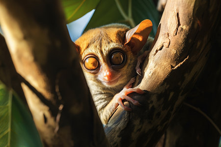 Tarsier primate holding onto a tree trunk in its natural rainforest habitat
