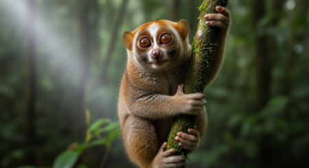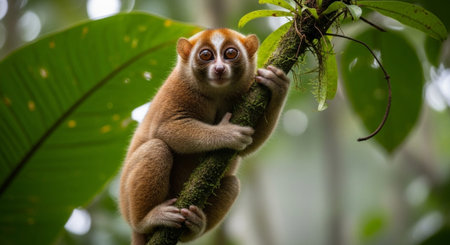 Nycticebus borneanus sitting on a tree branch in the rainforest of Indonesia