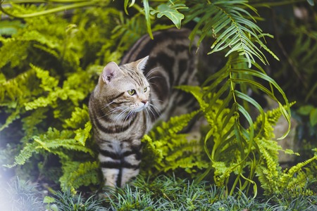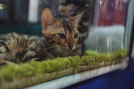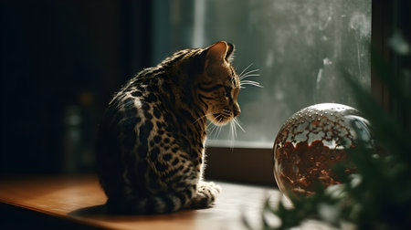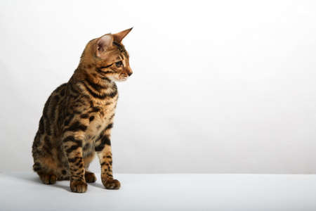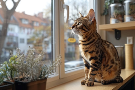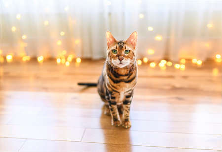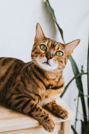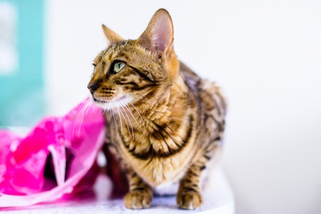 Exotic bengal cat breed kitten pet sitting near the window at home.