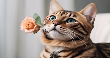A close-up of a green-eyed Bengal cat lying next to a bouquet of purple flowers against a light background. Conceptually, it suggests comfort, tranquility, and beauty.