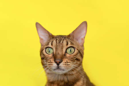 Bengal cat on a yellow background. A domestic thoroughbred cat. Pets.