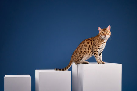 Studio photography of a bengal cat brown spotted on colored backgrounds