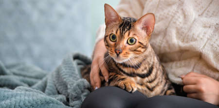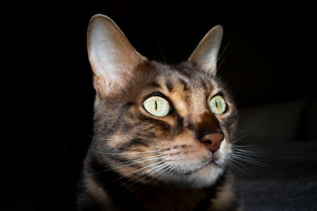 Portrait of a bengal cat, close up. cat in the home interior. Animals and lifestyle concept. Space for text