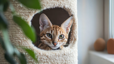 Portrait of a cat sitting on a cat tree in a stylish living room with copy space